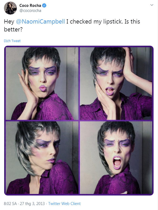 Khán giả chỉ thấy được cái bĩu môi của Coco Rocha trên sóng truyền hình nhưng ít ai biết được nữ siêu mẫu còn "lầm lội" đến mức nhắc lại câu chuyện này trên Twitter rồi tag hẳn Naomi vào. Tất nhiên là Naomi cũng không ngại ngùng gì mà vào đối đáp thẳng với đàn em!